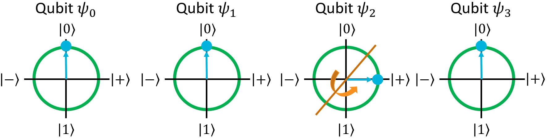 Single-qubit盖茨,甚至应用于寄存器,仍然只影响一个量子位。这些门可以被认为像函数只接受一个量子位的输入参数。他们可能有一个以上的总体参数,如任意旋转大门,但他们只有一个参数,是一个量子位。在本节中,我们将看看盖茨一个量子位的输入。