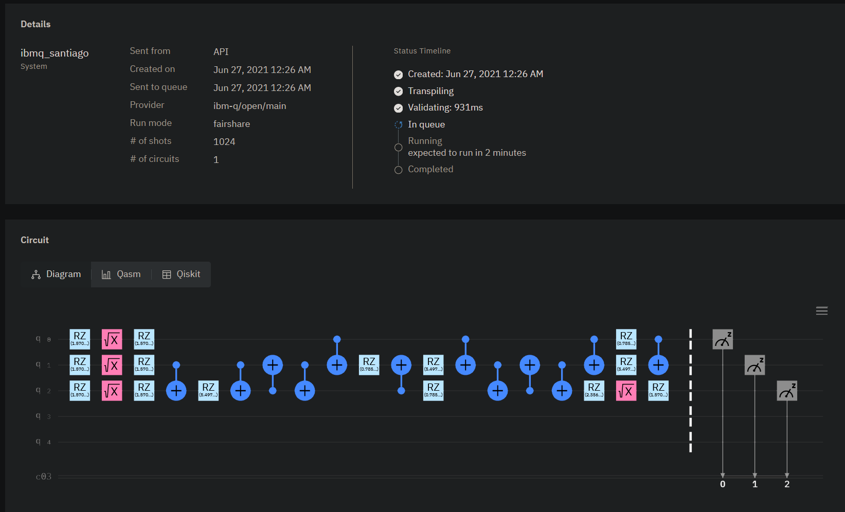 保存您的更改,然后运行python qiskit_reference.py执行程序。这将连接到IBM量子服务和电路添加到机器的队列。