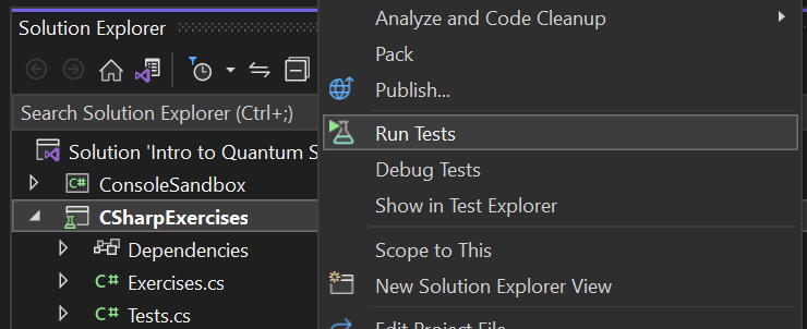 另外,如果测试不出现在测试浏览器(有时发生在目录移动和Visual Studio失去跟踪测试),您可以通过右键单击CSharpExercises直接运行测试或QSharpExercises目录内解决方案资源管理器并单击运行测试。